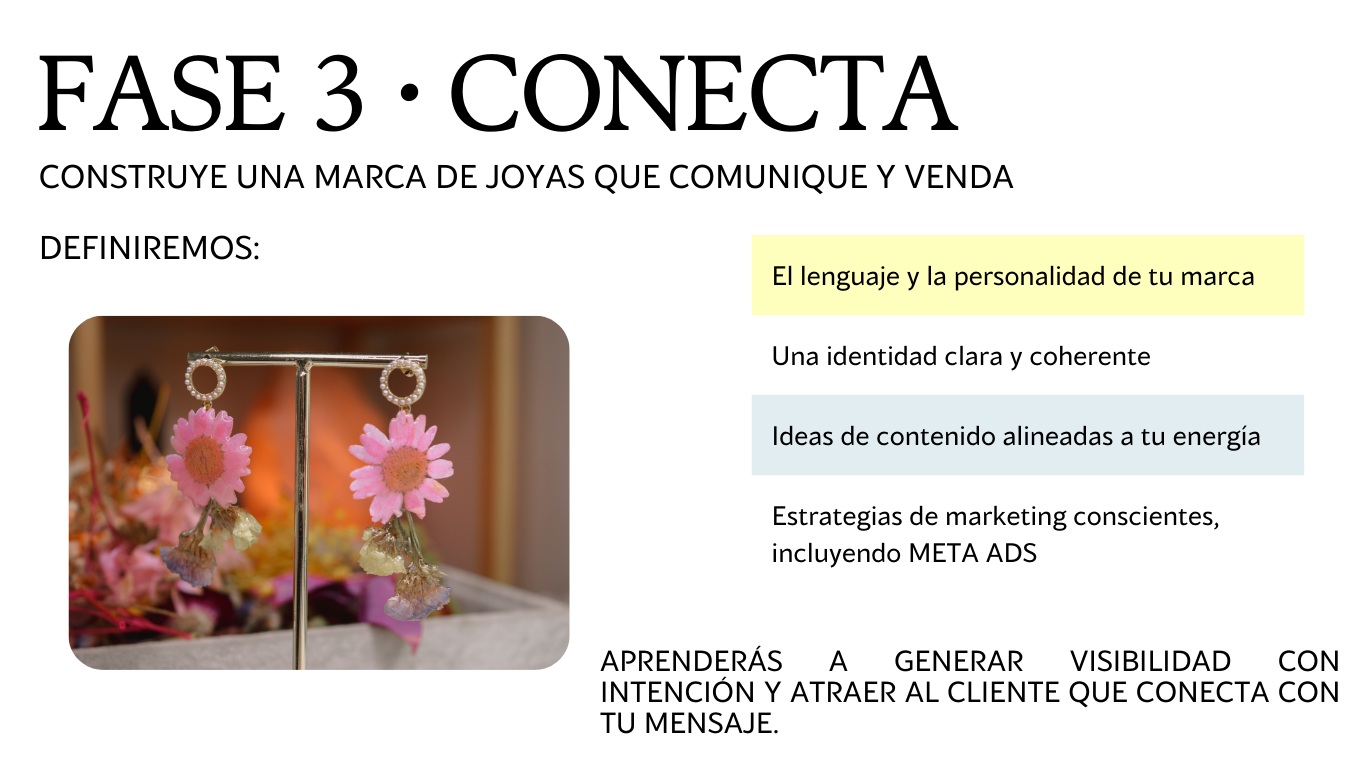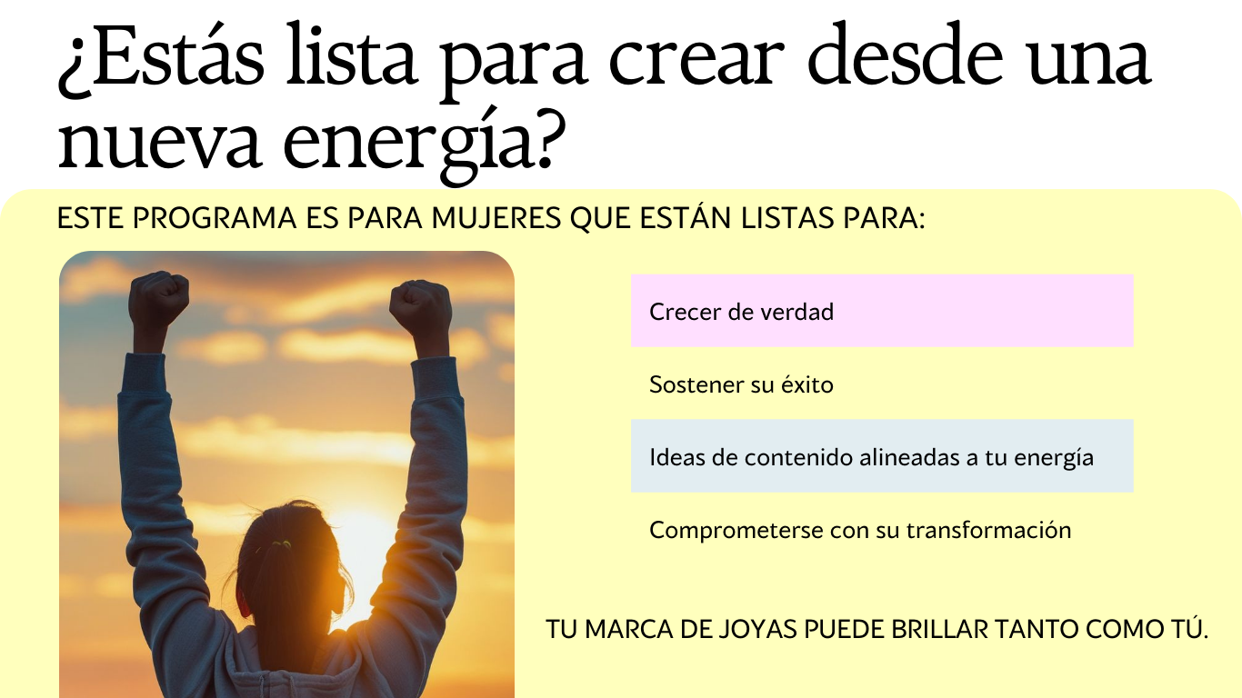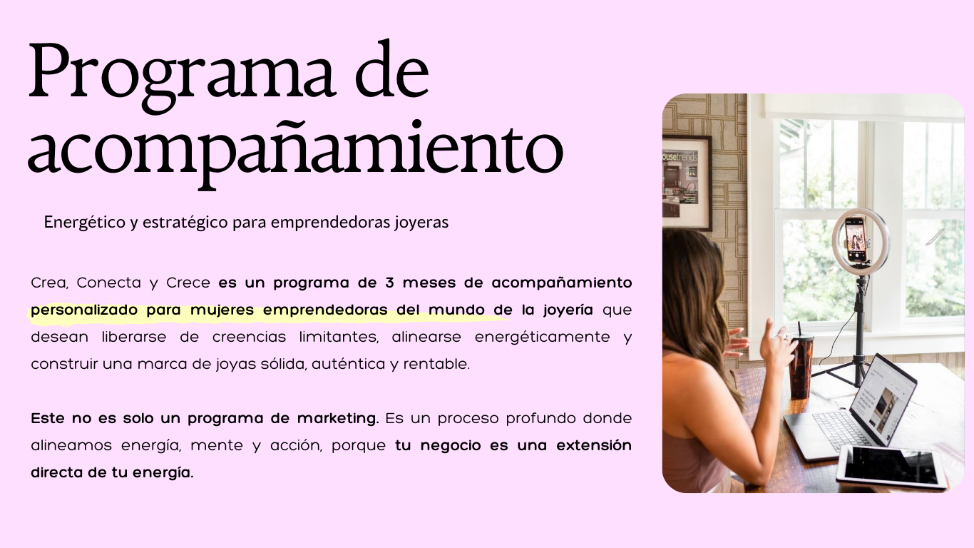 Crea, Conecta y Crece es un programa de 3 meses de acompañamiento personalizado para mujeres emprendedoras del mundo de la joyería que desean liberarse de creencias limitantes, alinearse energéticamente y construir una marca de joyas sólida, auténtica y rentable.