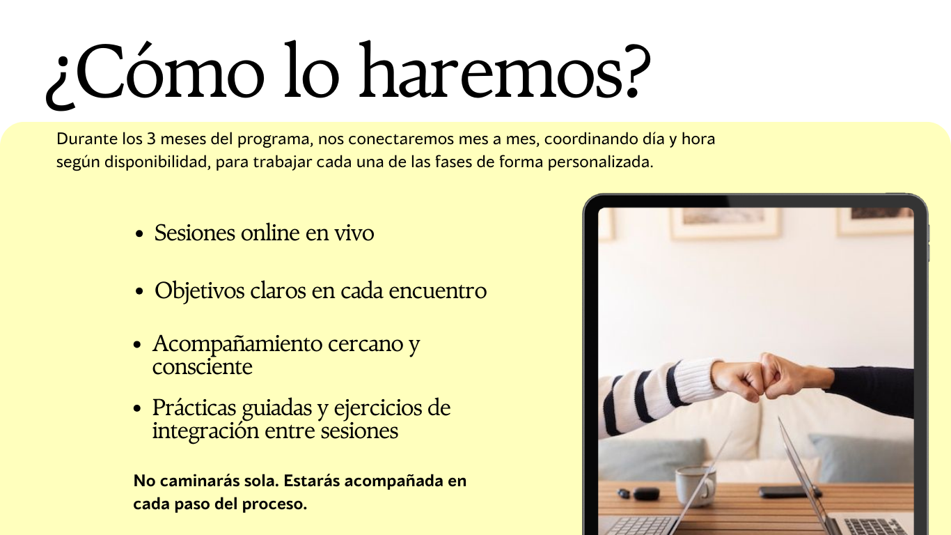 Durante los 3 meses del programa, nos conectaremos mes a mes, coordinando día y hora según disponibilidad, para trabajar cada una de las fases de forma personalizada.