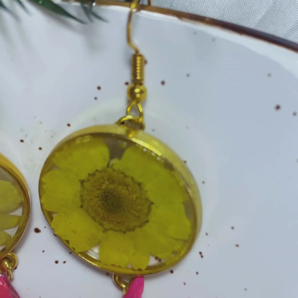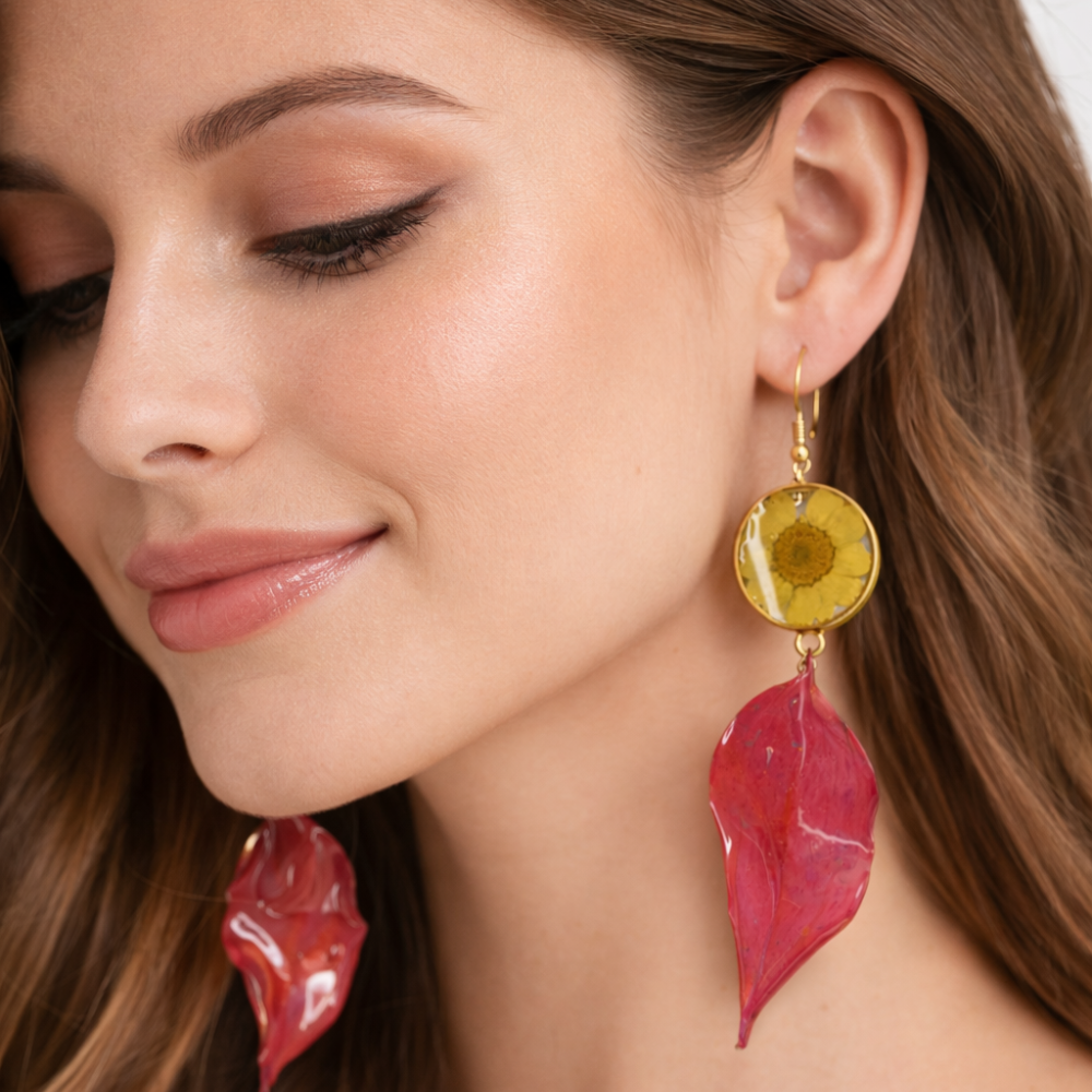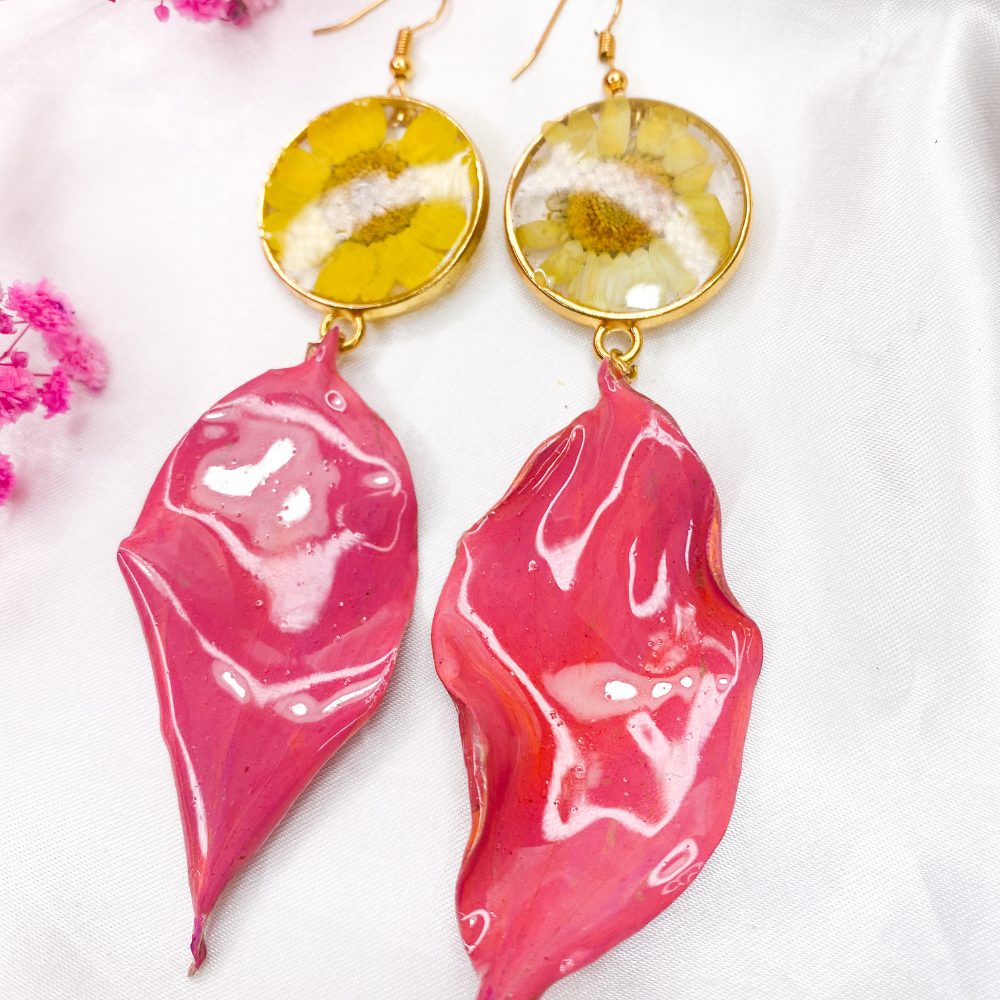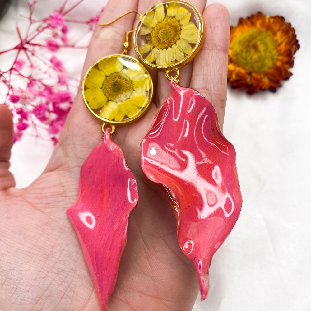 Estos pendientes largos de resina con flores son una pieza única de joyería artesanal inspirada en la naturaleza. Cada par está elaborado a mano con flores naturales prensadas y preservadas en resina transparente de alta calidad, logrando un diseño ligero y llamativo.