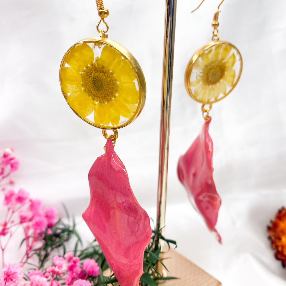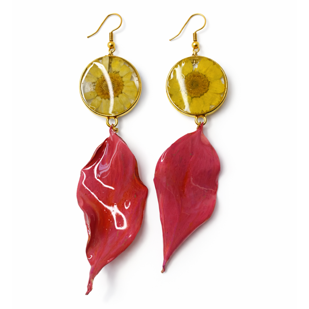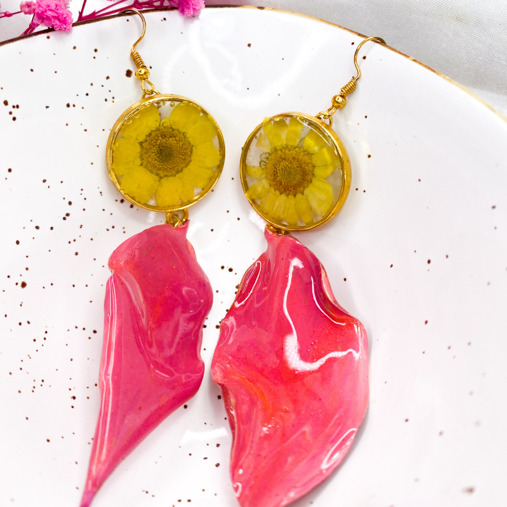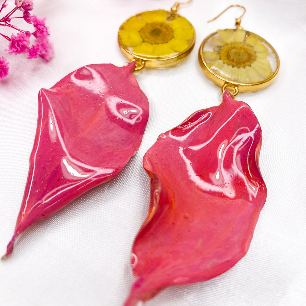 Estos pendientes largos de resina con flores son una pieza única de joyería artesanal inspirada en la naturaleza. Cada par está elaborado a mano con flores naturales prensadas y preservadas en resina transparente de alta calidad, logrando un diseño ligero y llamativo.