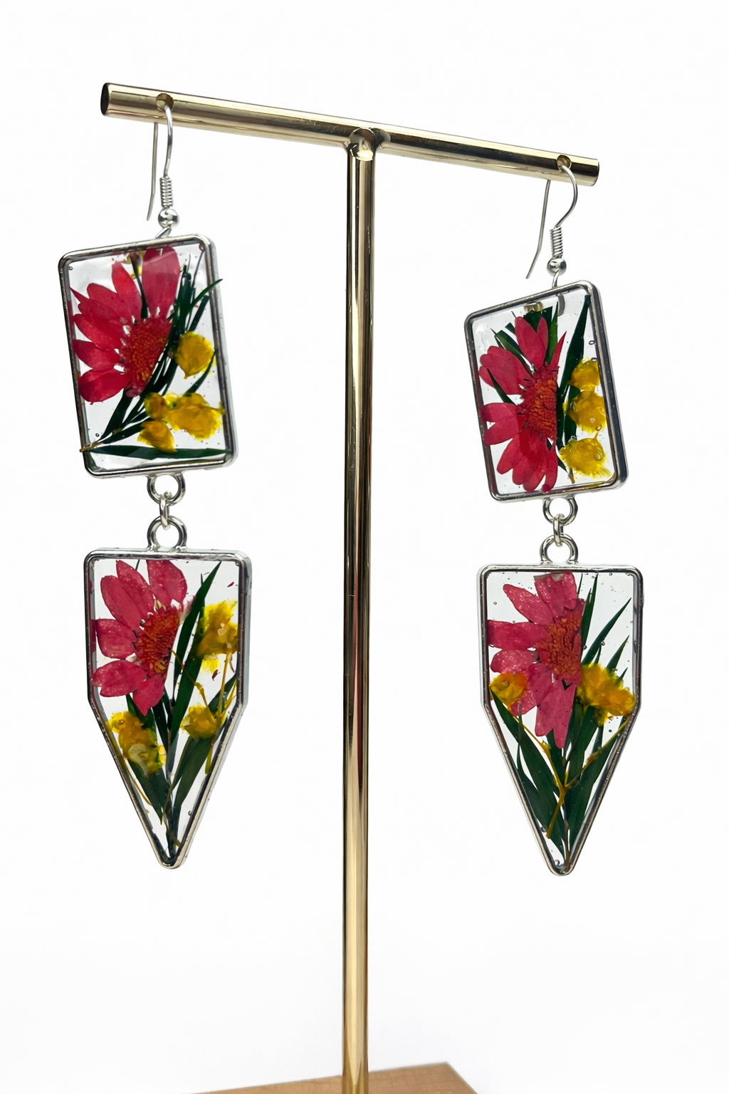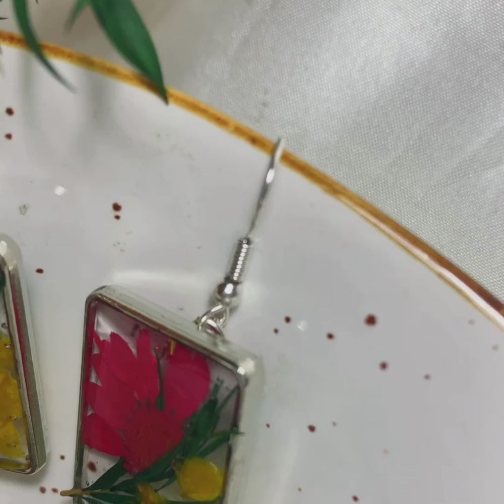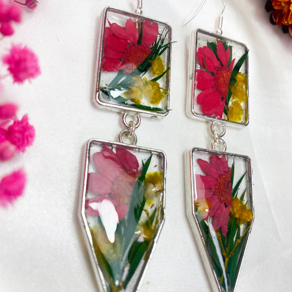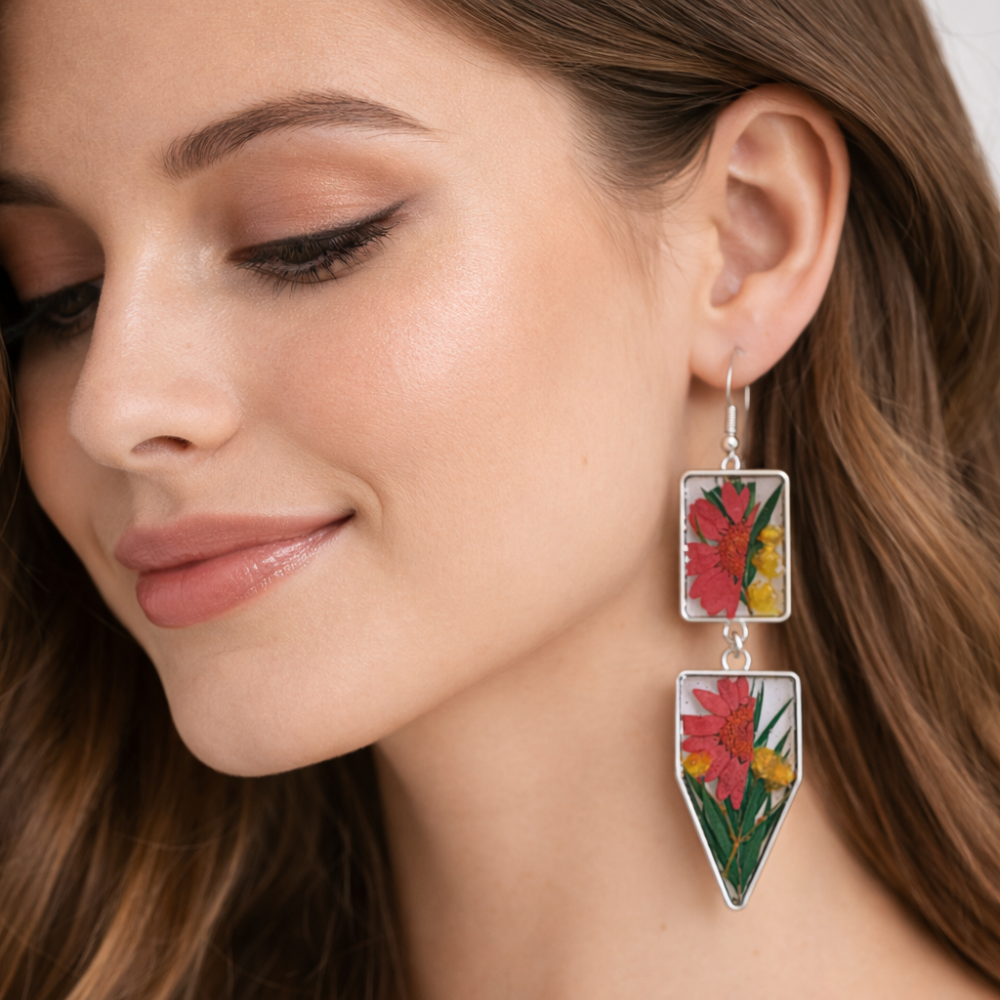 Estos pendientes largos de resina con flores son una pieza única de joyería artesanal inspirada en la naturaleza. Cada par está elaborado a mano con flores naturales prensadas y preservadas en resina transparente de alta calidad, logrando un diseño ligero y llamativo.