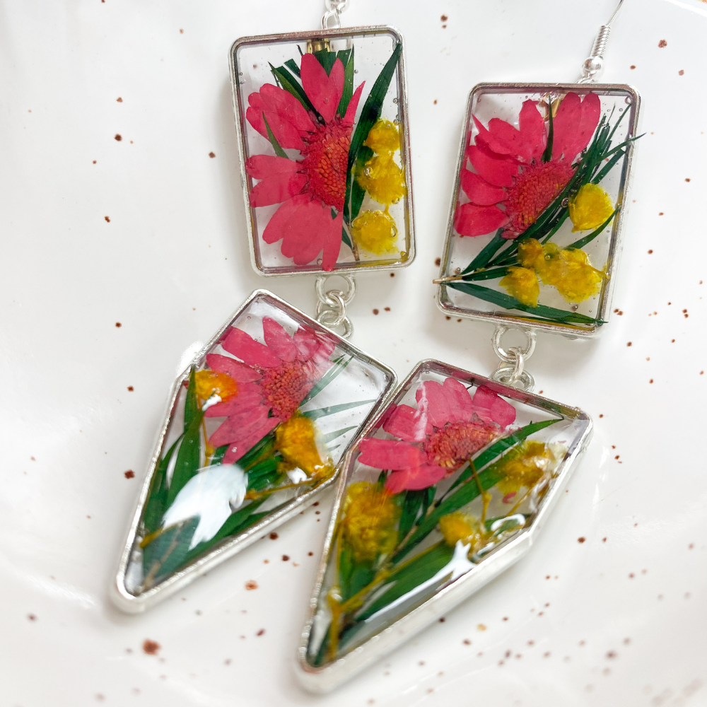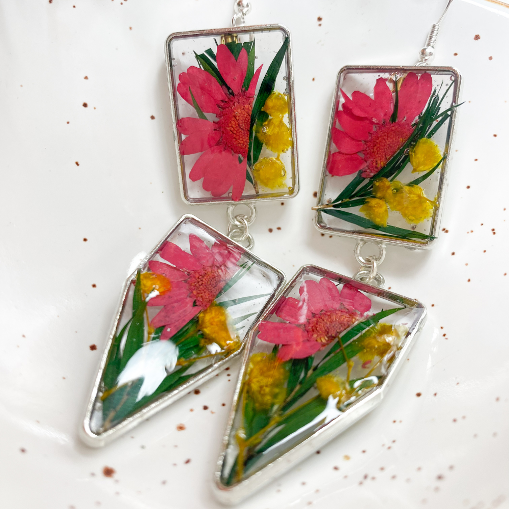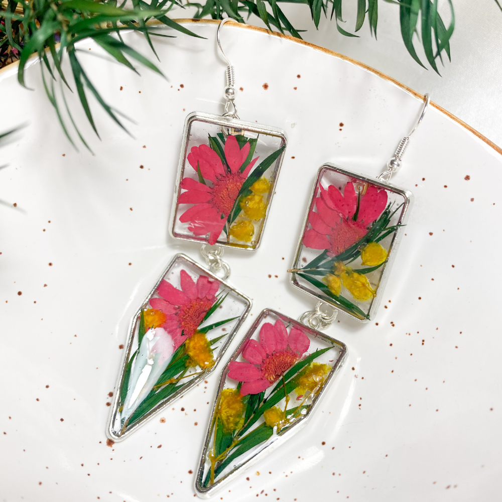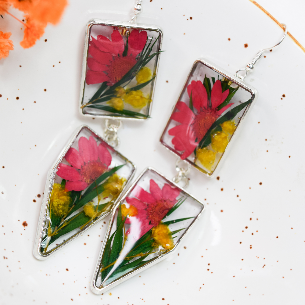 Estos pendientes largos de resina con flores son una pieza única de joyería artesanal inspirada en la naturaleza. Cada par está elaborado a mano con flores naturales prensadas y preservadas en resina transparente de alta calidad, logrando un diseño ligero y llamativo.