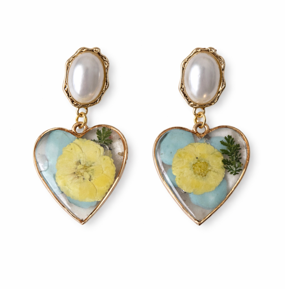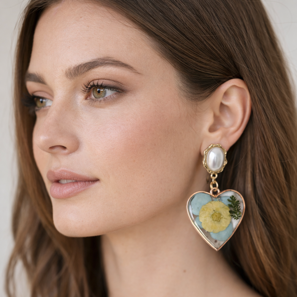 Estos pendientes largos de resina con flores son una pieza única de joyería artesanal inspirada en la naturaleza. Cada par está elaborado a mano con flores naturales prensadas y preservadas en resina transparente de alta calidad, logrando un diseño ligero y llamativo.